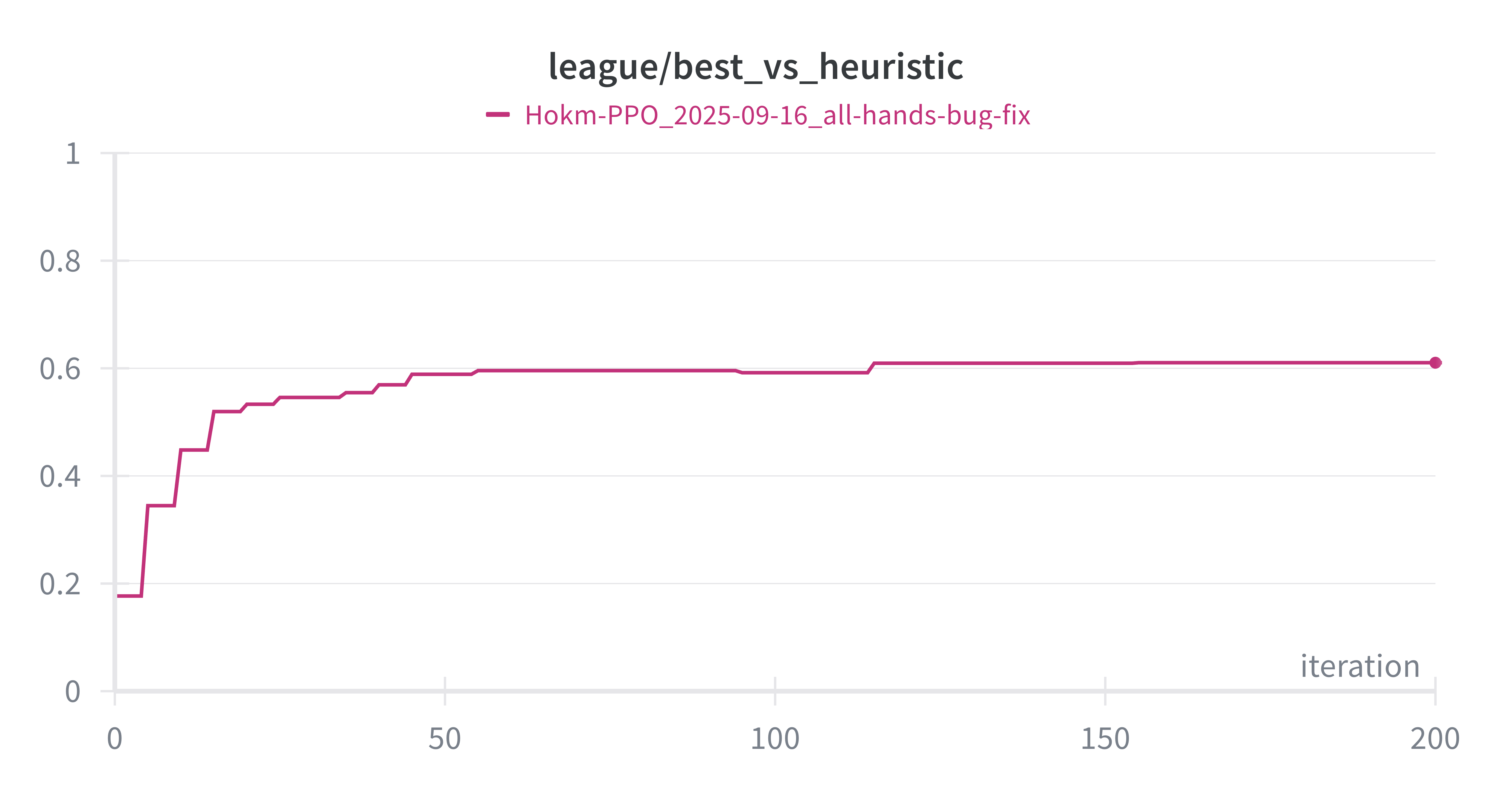 Model evaluation diverged sharply from single-player scenarios. In single-player games, cumulative discounted rewards provide clear performance metrics. However, multi-player self-play creates a different dynamic—agents achieve roughly 50% win rates against themselves by definition. To track training progress, I developed two benchmark opponents: a random policy executing random legal moves, and a heuristics-based player following basic Hokm heuristics. The heuristic agent defeats the random player over 70% of the time, establishing a meaningful performance ladder.