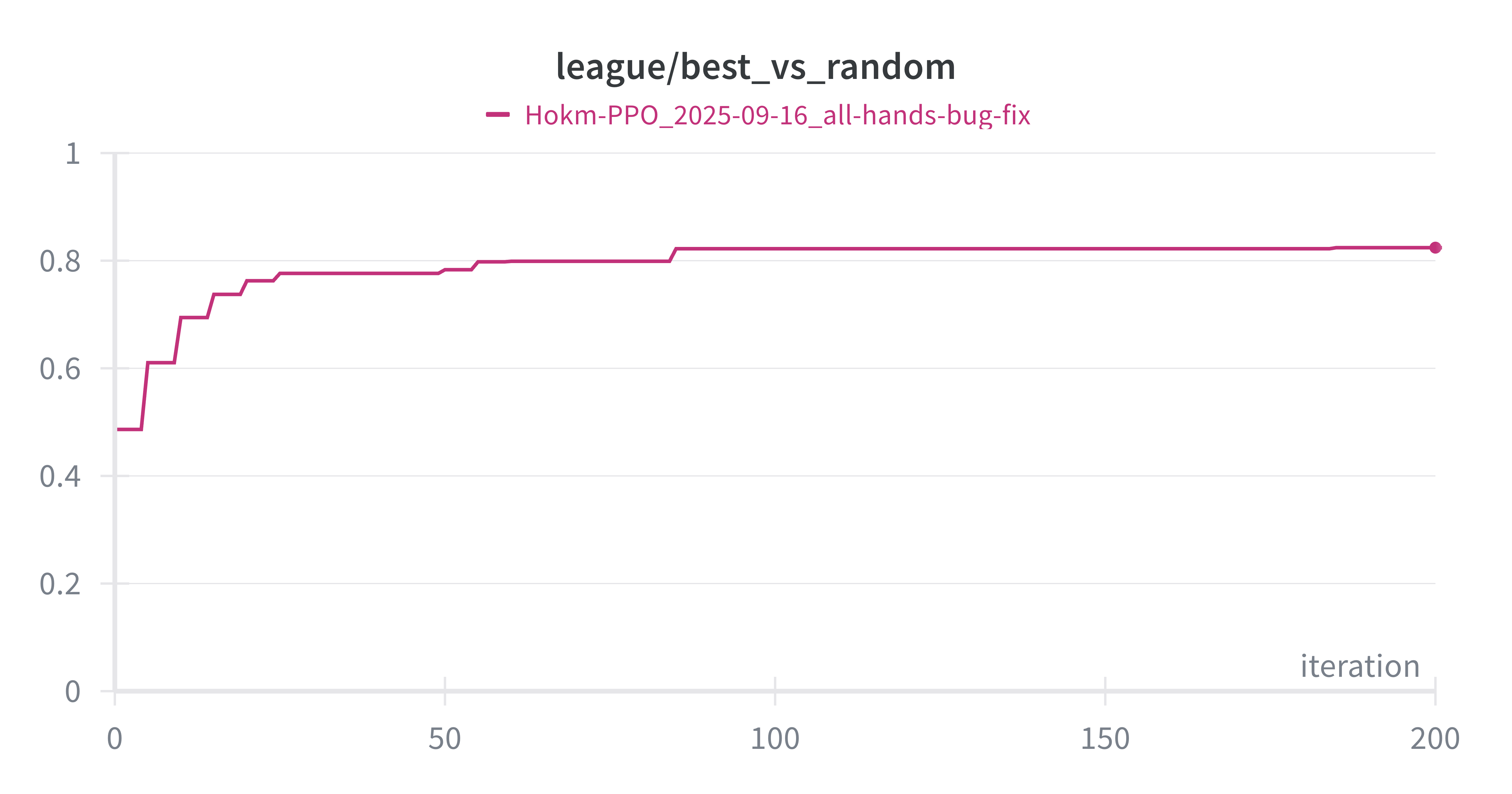 Instead, I adopted a proven multi-agent RL strategy: competing against “frozen” model versions. I constructed a fixed-size league initially populated with the untrained model. After every five training iterations, I conducted arena tournaments where the learning model played 1,024 games against each frozen opponent. When the learning model achieved 52% victory rates, I froze it, added it to the league, and continued training. Full leagues triggered the removal of oldest models, creating a dynamic opponent pool reminiscent of AlphaStar’s approach.